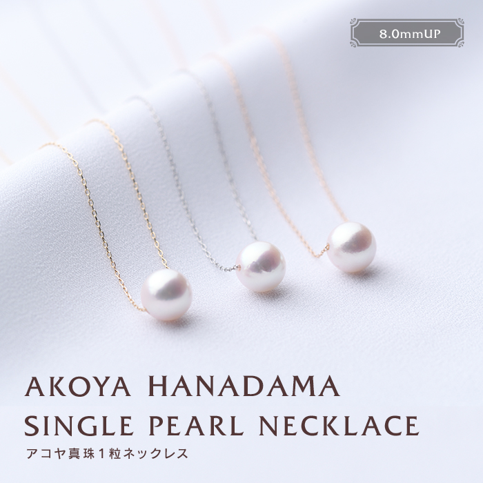 花珠真珠の最高品質8.0-8.5mmの1粒ネックレス。K18ゴールド・プラチナ製チェーンで上品な輝き。カジュアルからフォーマルまで幅広く使えるシンプルなデザインが魅力のパールネックレスです。