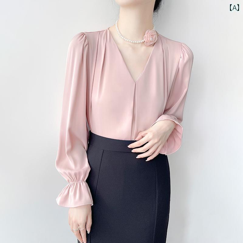 レディース 白シャツ ブラウス 長袖 春秋 Vネック 白 薄ピンク フラワーパールネックレス装飾 フレンチスタイル ワードロープ フレアプリーツ 袖口フリル エレガント シンプル ミニマル フォーマルのデザインと素材感